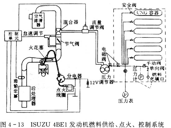 圖4-13是日本4BE1柴油機改裝成火花塞點火天然氣單燃料發動機的燃料供給、點火、控制系統示意圖。該機去掉了柴油噴射系統,增加天然氣供給系統、空燃比控制系統,并采用三元催化排放后處理器以降低排放,燃燒室容積增大,壓縮比由17.5變成12.5,并使燃燒室產生強渦流以實現良好的燃燒。