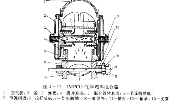 圖4-12所示為美國IMPCO混合器的示意圖。在進空氣的管道1中接入一個燃料氣管(虛線部分),在混合室處燃料氣管橫置,兩端有兩個錐形閥,錐形閥裝在膜片總成4中。膜片上有小彈簧3。燃料氣由中心管進入,空氣則沿著膜片閥所控制的環形氣道進入。