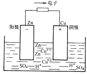 若將電極電位不同的兩種金屬(鋅和銅)浸入水和硫酸組成的電解質(zhì)中,既成原電池。如圖10-2所示。用外部電池將兩極連通時(shí),電子就會(huì)從鋅電極流向銅電極,即由負(fù)電位流向正電位,電流方向則從陰極(銅)流向極(鋅)。陽(yáng)極鋅離子Zn++不斷離開(kāi)金屬,與電解質(zhì)中硫酸根離子SO--4結(jié)合;在陰極聚集的電子與氫離子H+結(jié)合,在陰極表面釋出氫氣。這個(gè)過(guò)程的結(jié)果是陰極(銅)被極化,陽(yáng)極(鋅)被腐蝕。