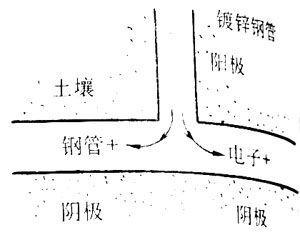 埋在土壤中的鍍鋅鋼管與鋼管,由于鋅的標(biāo)準(zhǔn)電極電位比鐵低,因此在電解質(zhì)(土壤)中,鍍鋅鋼管產(chǎn)生比鐵更多的負(fù)電荷,電子由鍍鋅鋼管流向鋼管,故作為陽極的鍍鋅鋼管將不斷被腐蝕。