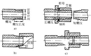 圓錐形管螺紋各圈螺紋的直徑都不相等,從螺紋的端部到根部螺紋直徑逐步增大呈錐形。這種管螺紋與管件的柱形內螺紋連接時,絲扣越擰越緊,接口較嚴密。管子螺紋連接一般均采用圓錐外螺紋與圓柱內螺紋連接,常稱錐接柱。一般不用柱接柱。用圓錐外螺紋與圓錐內螺紋連接,全部螺紋表面互相擠壓,嚴密性更好,但因圓錐形內螺紋管件加工困難,故錐接錐的連接方式很少用。用電動套絲機或手工管子絞板加工的為圓錐外螺紋。圖6-1為圓柱及圓錐管螺紋。管子絲扣閥門連接時,管端的外螺紋長度應比閥門的內螺紋長度短1~2扣絲,以免擰過頭,管子頂壞閥芯。同理,其他接口管子外螺紋長度也應比所連接配件的內螺紋的略短。連接管件用的長、短管螺紋及連接閥門的螺紋長度(圓柱形短螺紋與長螺紋尺寸)見表6-1。圓錐形管螺紋尺寸見表6-2。