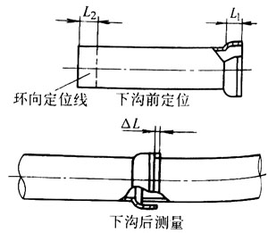 根據鑄鐵管承口深度L1,在管子下溝前,在其插口上標出環向定位線L1。見圖7-6。吊裝下溝就位后,檢查插口上環向定位線是否與連接的承口端面相重疊,以確定承插口配合是否達到規定要求。誤差△l不得大于10mm。