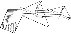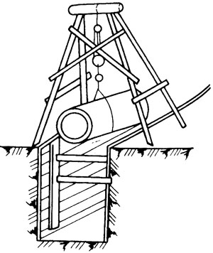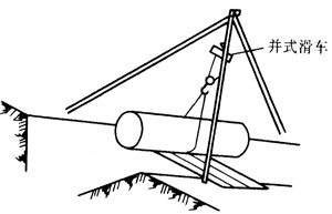 裝在塔架上的復式滑車、導鏈等設備進行下管,先將管子在滾杠上滾至架下橫跨溝槽的跳板上,然后將管子吊起,撤掉跳板后,將管子下到槽內。塔架數量由管徑和管段長度而定。參見表7-1。間距不應過大,以防損壞管子及防腐層。圖7-3為三腳塔架下管;圖7-4為高塔下管;圖7-5為導鏈下管。