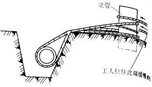 1)壓強繩下管法 在管子兩端各套1根大繩(繩子粗細的選擇由管子重量而定),借助工具控制,徐徐放松繩子,使管子沿溝壁或靠溝壁位置的滾杠慢慢滾入溝內。鑄鐵管下管多用此法。有防腐層鋼管用此法時,應在管下鋪表面光滑的木板或外套橡膠管的滾杠,再用外套橡膠管的撬棍將鋼管移至溝邊(途中如有堆土應先將堆土攤平),在溝壁斜靠滾杠,用兩根大繩在兩側管端1/4處從管底穿過,在管邊土壤中打入撬杠或立管,將大繩纏在撬杠或立管上二、三圈,人工拉住大繩,撬動鋼管,逐步放松繩子,使鋼管徐徐沿溝壁的滾杠落入溝中。溝底不得有磚頭、石塊等硬物,不得將鋼管跌入溝中。見圖7-2。
