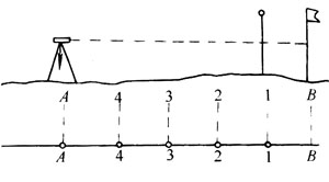 3. 直線測量 直線測量就是將施工平面圖直線部分確定在地面上,先按批準的管位量出直線段的起點與終點位置,按施工圖中的起點、平面與縱向折點及直線段的控制點與終點,在地面上丈量各點位置并打中心樁,樁頂釘中心釘,可用經緯儀定線。如圖4-1所示,使經緯儀中心對準起點A的中心樁的小釘,用望遠鏡對準B點的花桿,固定望遠鏡,另一人立花桿1在儀器的視線上,即可在立花桿1處打樁1,如此定出2、3等。沿中心樁撒灰線即管溝中心線。