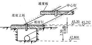 把管線中心線位置移到橫跨管溝的坡度板上。坡度板每隔10m或20m設一個,直接埋在地上,如圖4-2所示。在測管線中心線時,可按視線方向把中心線設在各坡度板上,并釘小釘標定位置。為了標明管溝開挖的深度,要在坡度板上做高程標志,可根據附近的水準點,用水準儀測出中心線上各坡度板板頂的高程。板頂高程與管底設計高程之差,就是從板頂往下開挖到管底的深度。將計算值標在坡度板上,以控制管溝開挖的深度和坡度。坡度板應不影響施工并妥善保護,這種方法只適用于人工挖土,用機械挖土時常用測挖深的方法。