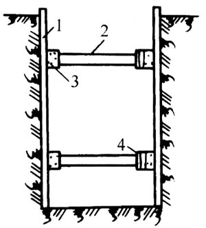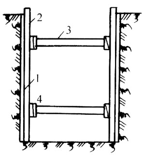2.連續式水平支撐 見圖4-7。擋土板水平放置,互相靠緊,不留間隔,然后兩側同時對稱立上豎枋木,上下各頂一根撐木,端頭加木楔楔緊。這種方法適用于挖掘較潮濕或散粒的土以及挖土深度小于5m的溝槽。
