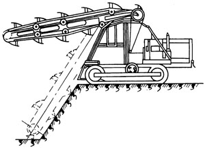 2.多斗挖溝機為履帶式,可連續開挖溝槽。多斗挖溝機向前行走。后面帶有圓輪的多斗挖掘機構循環轉動,土斗挖進土壤,把土鏟起,并把土經過短皮帶運至溝上一側或兩側。圖4-10所示為多斗挖溝機。在挖土過程中,挖掘機不間斷地向前開動,連續挖土,其前進速度根據土壤性質和挖掘深度來調節。如需挖較寬的溝槽,可更換閥切削邊的土斗或裝上兩排土斗。這種機械多用于挖掘直槽,當挖梯形槽時,需安裝有斜形側刀直徑較大的下鏈輪,用以切削溝槽邊坡的土。多斗挖溝機挖土深度易控制,開挖溝槽整齊,效率高,一般用于郊野溝槽的開挖。