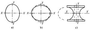1)無芯彎管機 鋼管煨彎時,管內不加芯棒。為了防止煨彎時產生橢圓斷 面,常采用反向預變形法,即在管子煨彎前,將管子的將彎曲處加壓力產生反向預變形。見圖5-9。當管子煨彎后,反向預變形正好消除,彎曲處管子斷面保持圓形,加壓預變形是通過滾輪胎具壓制而成的,滾輪胎具的凹槽是按照變形實際情況加工的,對不同管徑的管子要用不同滾輪胎具。