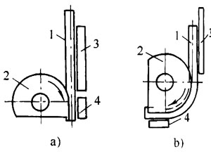 用電動彎管機彎管時,先把管子沿導板放在彎管模與壓緊模之間,見圖5-8a。壓緊管子后啟動開關,使彎管模和壓緊模帶著管子一塊繞彎管模旋轉,到需要的角度停車,如圖5-8b所示。