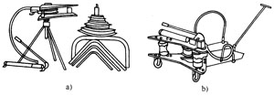 (2)小型液壓變管機 常用的小型液壓彎管機有三角架式與小車式彎管機,見圖5-7。它用手動液壓泵為動力,操作省力。彎管范圍為管徑15~40mm,適合現場使用。每一模具彎一種管徑的管子,需要有多種種模具。