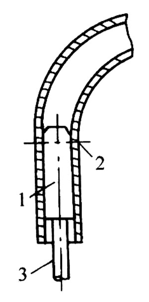 2)有芯彎管機 大直徑的鋼管,管壁較厚,常使用有芯彎管機。在管內放置芯棒,芯棒外徑比管內徑小1~1.5mm,放在管子開始彎曲面的稍前方。芯棒的圓錐部分與圓柱部分的交界線,要放在管子的開始彎曲面上。如圖5-10所示。如果芯棒伸得過前,可能使芯棒開裂;如果芯棒靠后,又會使管子產生過大的橢圓度。芯棒的正確位置可通過試驗獲得。