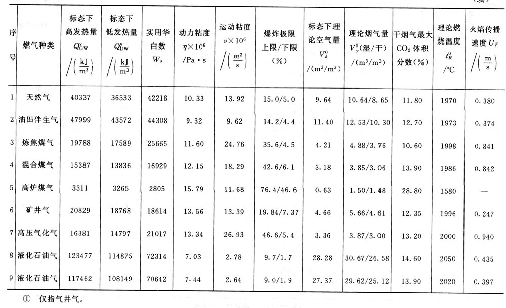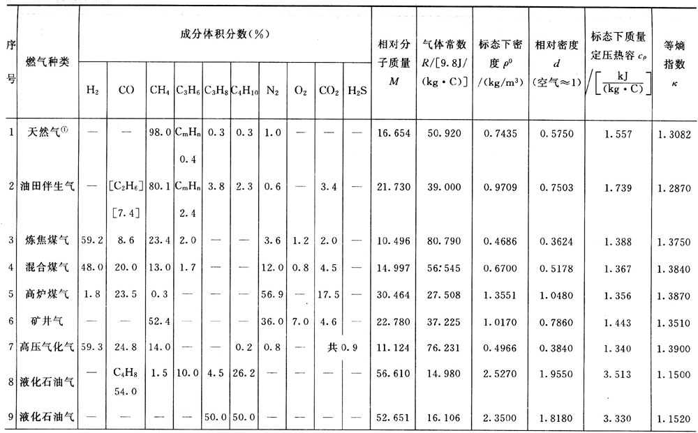 為了便于了解我國燃?xì)獾奶匦裕?-2列出了幾種常用燃?xì)獾某煞峙c特性數(shù)據(jù),這些燃?xì)饩哂幸欢ǖ拇硇裕晒﹨⒖肌5捎谖覈細(xì)夥植歼|闊,各氣源的天然氣或油田伴生氣的成分和特性并不完全相同;各地的人工燃?xì)庖餐捎谥茪鈺r(shí)所使用的原料(煤、石油)不同,采用的生產(chǎn)工藝不同,或使用的配氣比不同,同一類別的人工氣其成分和特性也不完全相同。因此在實(shí)際應(yīng)用時(shí),應(yīng)根據(jù)實(shí)際情況加以核對(duì)和分析。在正式設(shè)計(jì)和選用燃燒設(shè)備、燃?xì)忮仩t和進(jìn)行有關(guān)計(jì)算時(shí),應(yīng)盡可能收集有關(guān)氣源的詳細(xì)資料作為依據(jù)。