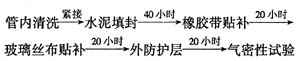防護(hù)層共為三劑二布(三層粘結(jié)劑,二層玻璃布)。氣密性試驗(yàn):當(dāng)完成防護(hù)層操作后,應(yīng)用軸流風(fēng)扇進(jìn)行強(qiáng)制通風(fēng)20小時(shí)以上,然后進(jìn)入管內(nèi)對(duì)每只修補(bǔ)接口進(jìn)行仔細(xì)檢查,確認(rèn)防護(hù)層已固化、無(wú)反邊,然后再進(jìn)行氣密性試驗(yàn)。上述各道工序的相隔時(shí)間為: