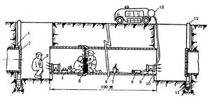 ①根據(jù)管內(nèi)通氣條件,內(nèi)修管段長(zhǎng)度一般取100米左右,二端各設(shè)工作坑,坑底澆混凝土基礎(chǔ),周圍用密板樁支撐并設(shè)集水井。