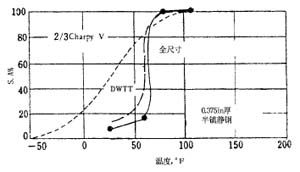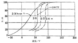 Battelle Memorial Iastitute(簡稱BMI,下同)在這方面作了大量的工作,圖2-5-2 為他們用同一種鋼管做了2/3Charpy V,DWTT,及全尺寸爆破試驗的韌脆轉變溫度曲線,由圖可以看出,DWTT曲線與全尺寸爆破試驗十分接近,而韌脆轉變溫度幾乎完全一致,均為75°F(23.9℃)。再看2/3Charpy V的曲線,看出該曲線與全尺寸曲線相距甚遠。之所以會有這種現象,是因為正如前面所述,Charpy V試樣要求標準厚度,因而它只能反映管材的材質情況,它反映不了管材的幾何尺寸(厚度)的情況,而厚度卻是有影響的,通常厚度越大,轉變溫度越高。為說明這一情況,用3/8,1/2,3/4英寸三種厚度的鋼管作了試驗,見圖2-5-3。
