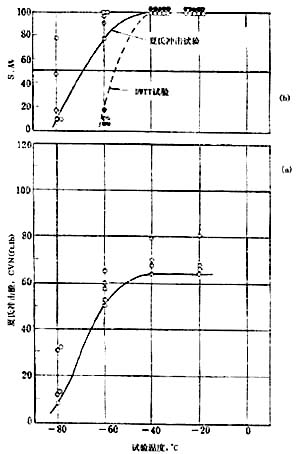 由圖2-5-1(a)看出,在某一溫度(在圖中約為-40℃)以上材料的夏比沖擊能(Charpy V Energy)基本上是不變的,但低于此溫度時,沖擊能迅速下降,這一由韌性開始向脆性轉變的溫度稱為管材的韌脆轉變溫度,或簡稱為轉變溫度。當溫度達到轉變溫度以后,繼續下降時,沖擊能繼續降低,至某一值時,沖擊能又大體保持衡定了,由圖看出,此時沖擊能已很低了。