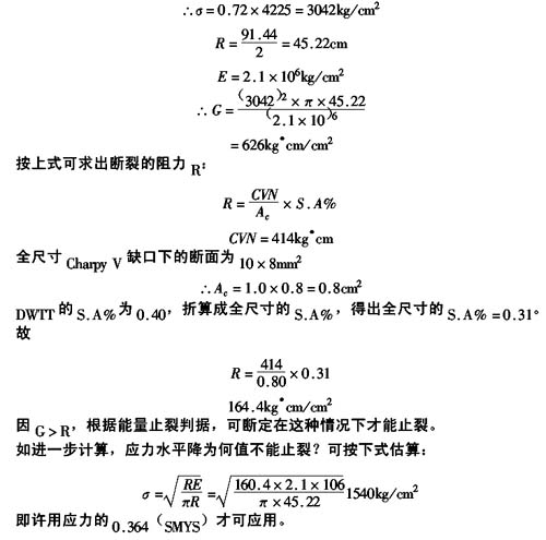 算例:有一批舊庫存管材希在新建管線上應(yīng)用,管線直徑914.1mm,厚度為9.9mm,材質(zhì)為X60,設(shè)計許用應(yīng)力為72%的規(guī)定的最低屈服極限(SMYS),材料在操作溫度(-25℃)下做DWTT試驗,多個試驗的平均值為S.A%=40%,該材料的上平臺值CVN=40.68J=4.14kg-m問該材料能否止裂,該材料的FATT=-15℃
