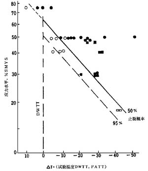圖2-5-7的橫坐標(biāo)為試驗溫度低于DWTT的FATT的數(shù)值,縱坐標(biāo)為試驗時的應(yīng)力水平。由圖中可以看出,雖然溫度低于FATT,但應(yīng)力也相應(yīng)降低以后仍然可以止裂。在90%線以下的范圍,止裂幾率可達95%;在50%及95%之間的區(qū)域,止裂概率為50%~95%。試驗還表明,當(dāng)σ≤30%(SMYS)時,一般均可得到止裂,最壞的情況擴展也不會超過5m。