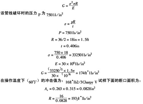 前面說過,管線二端遇到一根高韌性管段而止裂。止裂管段經Charpy V試驗,其FATT為0°F,由于在破壞溫度下做Charpy V試驗S.A=100%,故可止裂。
