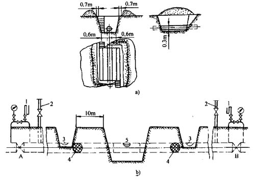 1)參照圖1-13-7按更換段長度開挖主作業坑,管道兩側至坑壁底線的距離不應小于0.6m,坑壁斜度視土壤致密程度而定。坑頂邊緣至堆土邊線的距離應保持0.7m;