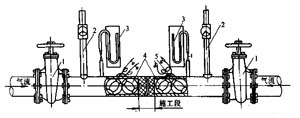 3.中壓管上停氣時,為防止閥門關閉不嚴密,造成施工管段內壓力增加,引起阻氣袋位移,使燃氣大量外泄,應在閥門旁靠近停氣管段一側鉆兩個孔,作為安裝放散管與測壓儀表用。見圖1-12-1。如果在燃氣管道的閥門井中均已安裝,則不必另行安裝。
