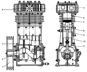 一臺活塞式壓縮機,不論其構造如何復雜,但組成機器的主要零部件不外乎是機身、曲軸、連桿、十字頭、氣缸、活塞、活塞桿、填料、氣閥(又稱活門)等(見圖1-11-1)。在機身上有曲軸軸承座、法蘭面,供安裝曲軸承和氣缸用,還有圓筒形滑道供十字頭導向用。