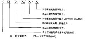(1)ZG-0.75/10~15型 ZG表示該壓縮機結構形式為立式,壓縮機的排氣量為0.75m3/min,吸氣壓力10kgf/cm2(0.98MPa),排氣壓力15kgf/cm2(1.47MPa)。