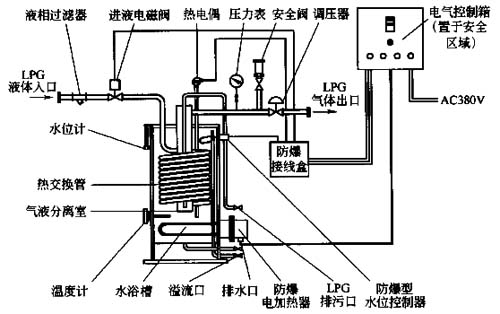 (1)工作原理液化氣由浸沒在溫水中的不銹鋼盤管內通過,吸收溫水的熱量后汽化并過熱,經過氣液分離器脫去重組分后輸入管網。