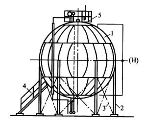 球形罐的容積較大,主要由殼體、人孔接管及拉桿等組成(見圖1-10-2),其殼體又由不同數量的瓣片組裝焊接而成(見圖1-10-3)。