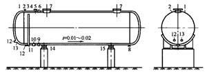 臥式圓筒罐是一種壓力容器,主要由筒體、封頭、人孔、支座、接筒、安全閥、液位計、溫度計及壓力表等部件組成(見圖1-10-1)。