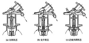 一般情況下緊急切斷閥處于全閉狀態[見圖1-8-12(a)],這時凸輪、閥桿都未被頂起,先導閥和主閥都未被閥桿推動,主彈簧和過流彈簧的壓力方向相反,但主彈簧的壓力大于過流彈簧的壓力。在主彈簧的壓力作用下,主閥和先導閥都處于全關閉狀態,以保證在非裝卸作業過程中,閥門、管路出現意外的情況下仍能保持罐體密閉,切斷氣相和液相與外界的通路。