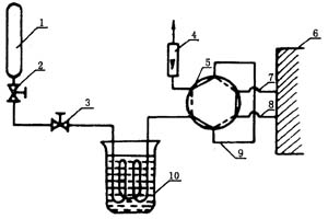 液化石油氣組成測定(氣相色譜法)的流程如圖1-6-2所示。氣相色譜儀的改裝主要對氣路進行改裝,要求是當C4組分出完后,轉動四通閥,可以反吹C5。如果使用鄰苯二甲酸二丁酯柱,在儀器靈敏度能夠達到檢出0.5%組成含量時,也可以不改裝儀器氣路。
