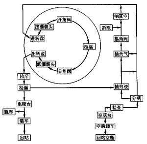 (3)機械化自動灌裝是指從空瓶卸車、灌瓶、復檢,直到重瓶裝車運出的全部過程均實現機械化和自動化。其主要設備是機械化灌裝轉盤機組,機組由裝有自動灌裝秤的轉盤、上瓶器、卸瓶器、檢斤和傳送帶組成。只要2~3人操作,每小時灌瓶能力可達1200瓶以上。機械化自動化灌裝流程如圖1-5-3所示。