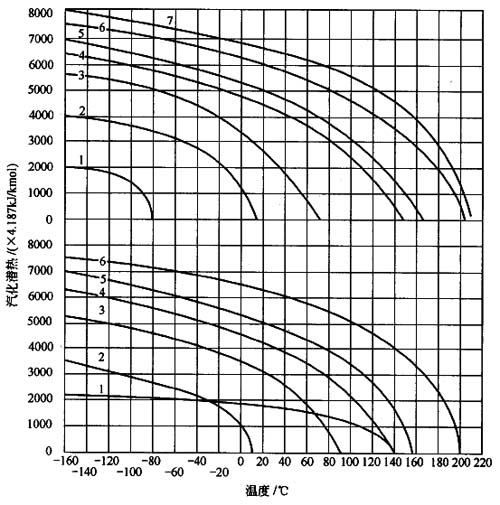 不同的液體有不同的汽化潛熱,即使是同一液體,其汽化潛熱也隨沸點(diǎn)不同而發(fā)生變化。當(dāng)液體的沸點(diǎn)上升時(shí)汽化潛熱相應(yīng)減少,在臨界溫度時(shí)汽化潛熱為零。一些液化石油氣各組分的汽化潛熱值如圖1-2-2所示。