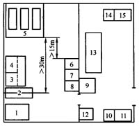 在圖1-3-2 中,儲罐區、灌裝區和輔助區呈一字形排列,灌裝區居中。把作為主要操作場所的灌裝區布置在居中位置,滿足了安全防火間距的要求,使儲罐區、灌裝區與生活區內的維修車間、食堂、鍋爐房、配電室等建筑物的防火距離符合防火間距大小的排列次序和數值要求,從而提高了土地利用率。