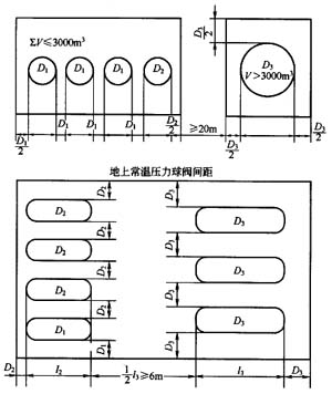 每組內的儲罐宜單排布置。其相互間的距離如圖1-3-3所示。