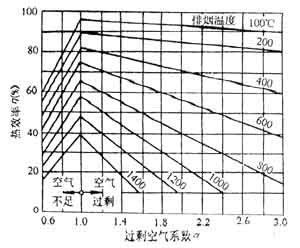 燃氣工業爐運行時,應嚴格控制爐內過??諝猓怪疂M足工藝和熱工要求。由第一章分析可知,過??諝饬刻髸е氯紵郎囟鹊慕档?;同時也會帶走一部分熱量,使爐子熱效率下降,如圖3—11—1右邊各線所示。空氣不足引起不完全燃燒,同樣也使熱效率降低。過??諝饬颗c爐子結構、操作條件及其他因素有關。