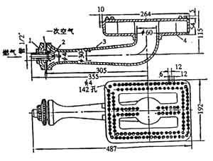 圖3—6—15所示為鑄鐵鍋爐上使用的大氣式燃燒器。頭部為長方形,其上有142個4mm的火孔,燃燒器熱負(fù)荷為20kW。為了保證燃燒完全,布置火孔時應(yīng)至少應(yīng)保證二次空氣從一側(cè)供給火孔。
