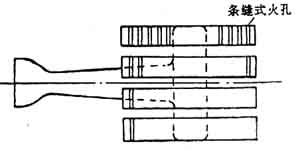 (2)單火孔頭部 對某些要求火力集中和火孔熱強度高的大氣式燃燒器,常采用孔徑較大的單火孔頭部。單火孔頭部的結構形式也很多。圖3—6—19所示為工業用單火孔大氣式燃燒器的頭部,它由火孔、二次空氣口及火道三部分組成。燃燒所需要的二次空氣由爐內負壓吸人,二次空氣口外面安裝調風板,調節二次空氣的吸入量。由于燃燒器噴口為一個大火孔,其火焰與二次空氣的接觸面積比多火孔小,因此這種燃燒器的火焰較長,只適用于有爐膛的工業加熱設備上。為了防止回火,火孔出口速度應比多火孔大,所以需要用中(高)壓燃氣?;鸬滥芷鸱乐姑摶鸬淖饔?。