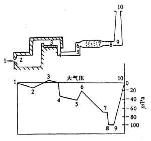 圖3—9—15為工業(yè)爐自然通風(fēng)時(shí)爐膛及煙道系統(tǒng)壓力分布圖。橫坐標(biāo)對應(yīng)上圖示意的通風(fēng)系統(tǒng)各處;縱坐標(biāo)為各處的相對壓力(Pa)。
