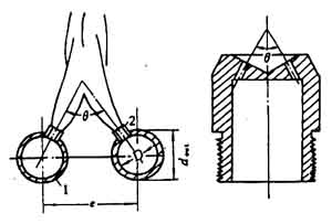 如圖3—6—2所示,采用兩個擴散火焰相撞的方法來加強氣流擾動,強化燃氣與空氣的混合,從而提高燃燒穩定性和強化燃燒過程,提高燃燒溫度。兩個火焰噴出方向的夾角θ一般為50°~70°,兩根火管的中心距約為其外徑的兩倍。為使燃氣均勻地分布在各火孔上,火孔總面積必須小于管子截面積。