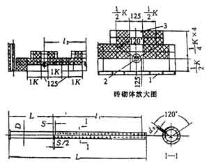 這種燃燒器,主要用于小型燃煤鍋爐改燒燃氣。其構造如圖3—6—4,由直管式擴散燃燒器和火道組成。該燃燒器工作時,空氣靠爐內負壓吸入,咀可用鼓風機供給。燃氣經火孔逸出后與空氣成一定角度相遇,進行紊流擴散燃燒。