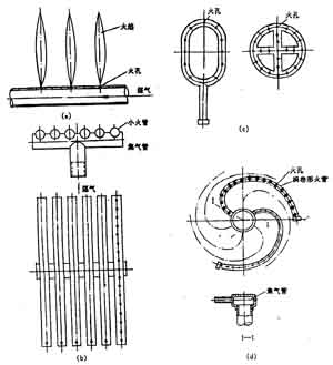 圖3—6—1(d)為渦卷管式燃燒器,其頭部為若干根鉆有火孔的渦卷形管子焊在一根集氣管上。這樣,火孔布滿了整個圓面,而且每個火焰都能充分接觸空氣,燃燒較完全。火管一般由內徑φ4~8mm的銅管或鋼管制成,集氣管的內截面積應大于各火管內截面積之和。