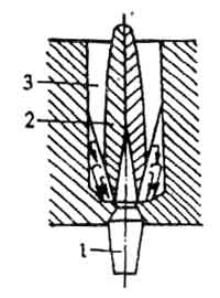 完全頂混式燃燒的燃燒速度很快,但火焰穩定性較差。工業上的完全預混式燃燒器,常常用一個緊接的火道來穩焰。圖3—5—12所示為火道中火焰的穩定。來自燃燒器1的燃氣—空氣混合物進入火道3,在火道中形成火焰2。由于引射作用,在火焰的根部吸入熾熱的煙氣,形成煙氣回流區,是一個穩定的點火源。如果火道有足夠的長度,則火焰將充滿火道的斷面,燃燒就穩定。但火道較短時,火焰僅占火道的一部分,可能會吸入來自周圍的冷空氣使燃燒中斷。另外,如果火道的壁面未達到熾熱狀態,也將增加煙氣向周圍介質的熱損失,使煙氣溫度降低而失去點燃混合物的能力,因此必須對燃燒室采取良好的保溫措施。