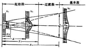平行氣流中的自由射流邊界仍然是直線,但基本段的邊界線不同于起始段及過渡段,其極點到射流出口的距離為x0。