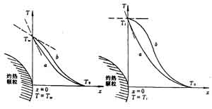如果顆粒溫度升高,TW1>TW則溫度分布線b、a的差異更加顯著,a線更陡峭,b線更平坦,也就是對可燃混合氣而言,隨灼熱體溫度升高,附面層燃燒反應加劇,界面上的溫度梯度(dt/dx)x=0=0愈來愈小,灼熱體向附面層傳熱愈少。