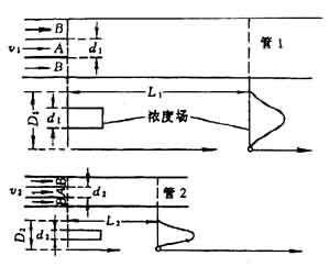 可以利用相似關系,直觀定性地討論層流擴散火焰理論。如圖3—5—3,兩個相似的擴散燃燒裝置,管1和管2,都從同心內管A和環管B中分別通入燃氣和空氣,而且兩種氣體的流速相等。圖中還繪出了燃氣在管道斷面上的濃度分布。在燃氣射流的初始截面上,其濃度為均勻分布,濃度場呈矩形。由于不斷燃燒,在距離L