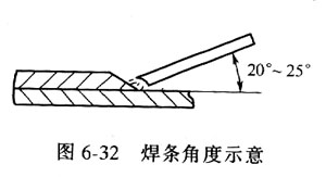焊接的順序是,先焊特殊位置或不好焊的位置,如仰焊;后焊正常位置或好焊的位置,如平焊,這樣可以有效地保證焊接的質量。因為先焊時,泄漏介質的干擾會小一些,隨著焊接的進行,泄漏介質的干擾會明顯增大,當焊到有小量泄漏介質外泄的位置時,焊接后,在焊縫上可能出現氣孔或其他焊接缺陷,甚至在焊縫上仍有泄漏存在,這時可用刨錘或樣沖將其捻嚴,再在其上復焊一層焊肉。焊接時的焊條角度如圖6-32所示。引流器的四周焊好后,應認真檢查一遍,確認無誤后,即可關閉閘板閥,實現帶壓堵漏作業的目的。