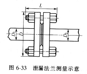 b. 法蘭泄漏的引流焊接堵漏 首先測量泄漏法蘭的有關數據,泄漏兩法蘭的總寬度L,法蘭的最大外徑D,法蘭接管的尺寸D1、D2,如圖6-33所示。根據這些數據設計一個法蘭專用引流器,結構如圖6—34所示。法蘭引流器的壁厚應根據泄漏介質的壓力而定,引流器的加工精度視泄漏介質的壓力、泄漏量的大小而定。精度要求較高時,可首先焊制成一個封閉的圓柱形盒體,圓柱形盒體的內壁寬度應大于兩塊法蘭及連接螺栓的總長,一般應大于這一尺寸的10~30mm為宜。盒子焊好后,用銑床或鋸床在直徑上斷開,斷開后再點焊上,然后加工兩個圓φ1、φ2,引流閥應開設在圓柱盒的徑方向上,當泄漏量較大,一個引流閥難以達到引流目的時,則應當開設多個引流閥,以達到順利排放泄漏介質的目的。引流閥可選用DN15~80 mm的閘板閥。